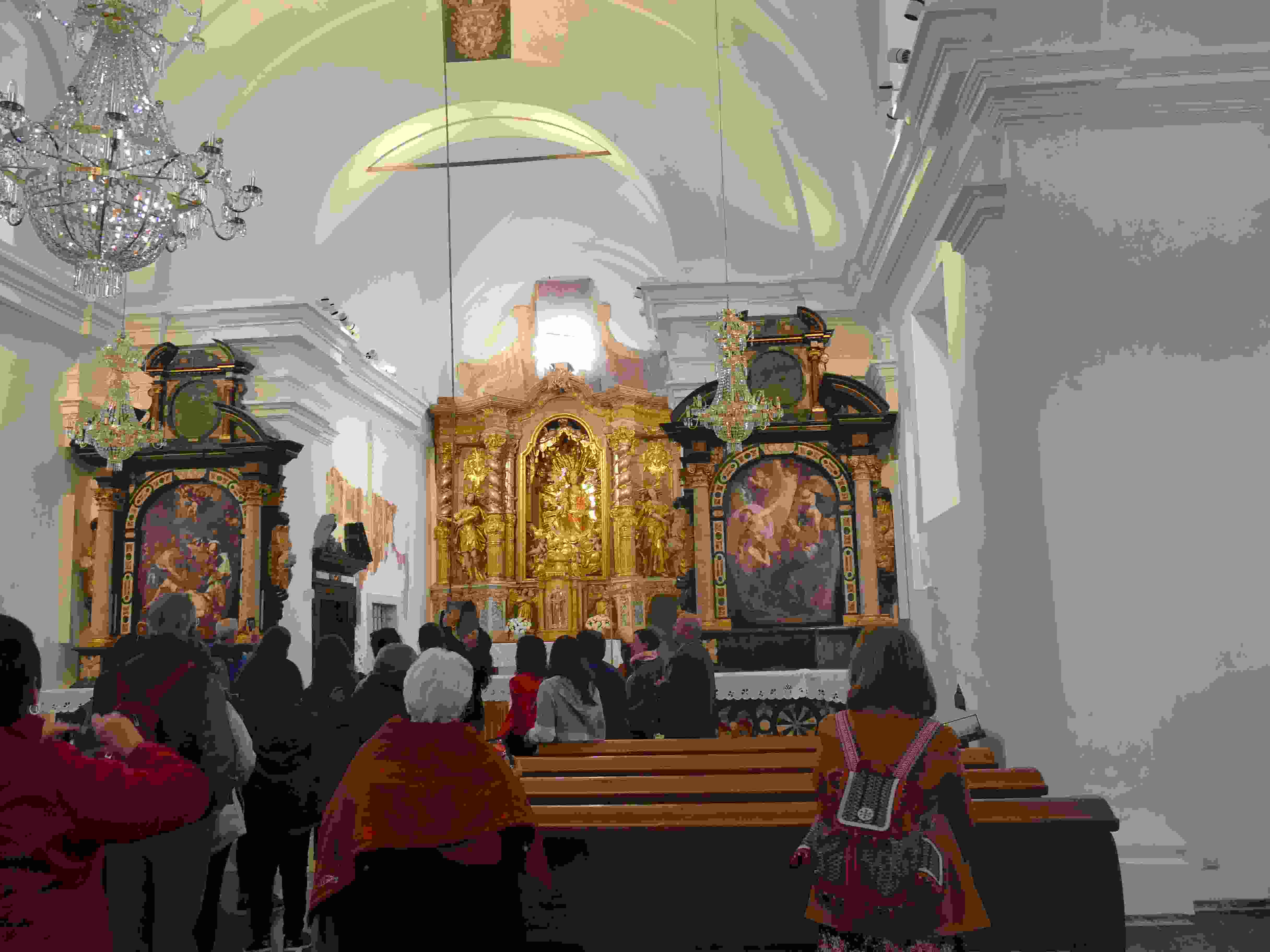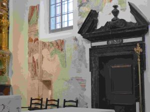 The church on the hill and some renovated frescos that have been recovered from an historic dig.