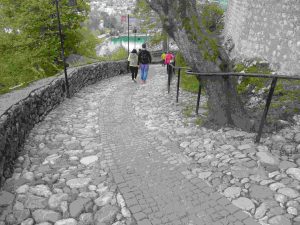 What she failed to mention was the long, winding, slippery cobblestone path instead of steps.